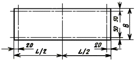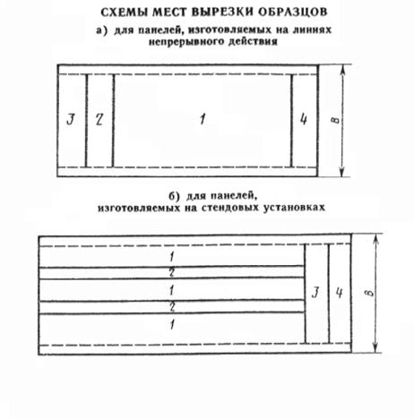 4.3. При непрерывном способе производства внешний вид, геометрические размеры, непрямоугольность, непрямолинейность, неплоскостность, смещение кромок листов определяют для 1,5 %, а при стендовом способе производства - для 3 % панелей, входящих в состав партии, но в обоих случаях не менее чем для трех панелей. Выборку панелей осуществляют по ГОСТ 18321-73. 4.4. Для определения разрушающей нагрузки на образцы, а также физико-технических свойств и механических показателей пенополиуретана из партии панелей отбирают по ГОСТ 18321-73 не менее трех панелей. Из каждой панели вырезают в соответствии со схемой черт. 7 по три образца для каждого вида испытаний. 4.6. Не реже одного раза в год, а также при освоении производства панелей, при изменении их конструкции, марки и рецептуры пенополиуретана или технологического процесса изготовления панелей следует проверять соответствие панелей требованиям настоящего стандарта по показателям, приведенным в табл. 7. Проверка должна производиться органом технического контроля предприятия-изготовителя, при необходимости - с участием представителей организаций разработчика и основного потребителя. При этом разрушающую нагрузку при поперечном изгибе определяют на шести образцах панелей партии длиной до 3000 мм, а физико-технические свойства и механические показатели пенополиуретана - на шести образцах, вырезанных из шести панелей партии, для каждого вида испытаний. Панели должны отбираться из партии по ГОСТ 18321-73. 4.7. Если проверяемые панели хотя бы по одному показателю не будут удовлетворять требованиям стандарта, следует проводить повторную проверку по этому показателю удвоенного количества панелей данной партии. 4.8. Если при повторной проверке хотя бы одна панель не будет удовлетворять требованиям стандарта, все панели должны приниматься органом технического контроля предприятия-изготовителя поштучно. 4.9. Результаты приемочного контроля каждой партии панелей должны быть записаны в журнале технического контроля предприятия-изготовителя. 4.10. Потребитель имеет право проводить контрольную выборочную проверку соответствия панелей требованиям настоящего стандарта, применяя при этом приведенные ниже методы контроля и испытаний. 5. МЕТОДЫ КОНТРОЛЯ И ИСПЫТАНИЙ5.1. Марку, толщину и вид покрытия металлических листов, марку пенополиуретана, количество пламегасящих добавок проверяют по паспортам предприятий-поставщиков. В необходимых случаях проверка указанных выше показателей может проводиться путем отбора и испытания (измерения, анализа) образцов (проб) материалов. 5.2. Внешний вид панелей и защитного покрытия металлических листов проверяют путем осмотра и сравнения с утвержденным эталоном. 5.3. Комплектность панелей проверяют в соответствии со спецификацией заказчика. Маркировку и упаковку проверяют путем осмотра пакетов панелей. 5.4. Контроль геометрических размеров панелей 5.4.1. Геометрические размеры панелей проверяют на соответствие их требованиям, приведенным в пп. 2.2.1 - 2.2.5. Для проверки следует применять измерительный инструмент 1-го класса точности. 5.4.2. Длину и ширину панелей измеряют стальной рулеткой: длину - на расстоянии 50 мм от продольных кромок, ширину - на расстоянии 20 мм от торцевых кромок и посредине длины панели, в соответствии с черт. 2. 5.4.3. Толщину панелей измеряют штангенциркулем в во