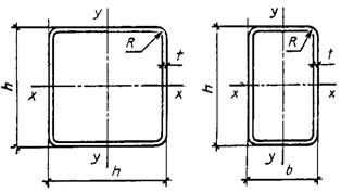 Рисунок 1 Рисунок 2 Обозначения к рисункам 1, 2 и таблицам 1, 2: h ¾ высота (ширина); b ¾ ширина; t ¾ толщина стенки; R ¾ радиус наружного закругления; l ¾ момент инерции; W ¾ момент сопротивления; i ¾ радиус инерции. 3.2 Размеры профилей, площадь поперечного сечения, справочные величины для осей и масса для 1 м профиля должны соответствовать для квадратных профилей таблице 1; для прямоугольных профилей ¾ таблице 2. Таблица 1
