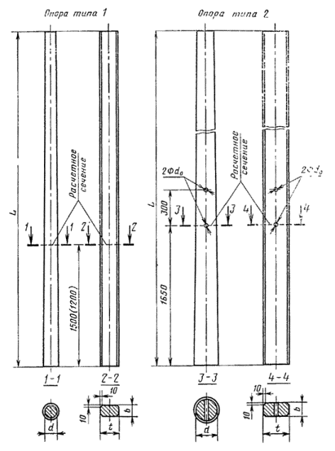 Постановлением Государственного комитета СССР по делам строительства от 14 сентября 1982 г. № 214 срок введения установлен с 01.01.84 Настоящий стандарт распространяется на деревянные опоры, предназначаемые для установки дорожных знаков по ГОСТ 10807-78. 1. ТИПЫ, ОСНОВНЫЕ ПАРАМЕТРЫ И РАЗМЕРЫ1.1. Опоры для установки дорожных знаков подразделяют на два типа: 1 - со сплошным поперечным сечением; 2 - с ослабленным поперечным сечением (безопасные). 1.2. Опоры типа 1 изготавливают длиной 3500, 4000, 4500, 5000 и 5500 мм, типа 2 - длиной 5500, 6000, 6500, 7000, 7500, 8000 и 8500 мм. 1.3. Параметры опоры в зависимости от типоразмера числа знаков, устанавливаемых на опоре, и изгибающего момента в расчетном сечении следует выбирать согласно рекомендуемому приложению. 1.4. Форма и основные размеры опор должны соответствовать указанным на чертеже и в таблице. 1.5. Марка опоры состоит из буквенно-цифровых групп, разделенных тире. Первая группа содержит: цифровое обозначение типа опоры (см. п. 1.1);