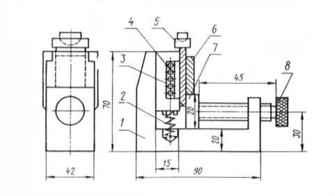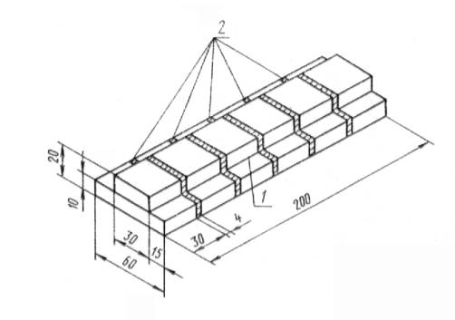 1 - корпус; 2 - пружина; 3 - подвижная планка; 4 - ролики; 5 - съемная нажимная призма с шаровой опорой; 6 - образец; 7 - подвижная опора; 8 - прижимной винт. 2. ПОДГОТОВКА ОБРАЗЦОВ К ИСПЫТАНИЮ2.1. Образцы для испытания изготавливают из асбестоцементных плоских листов по ГОСТ 18124-72, при этом влажность листов, из которых склеивают образцы не должна превышать 6%. Примечание. В случае, если объемная масса асбестоцемента будет менее 1,6 г/см3, допускается склеивание при влажности не более 10%. 2.2. Для изготовления образцов берут заготовку, которую склеивают специально или выпиливают из готовой продукции по форме и размерам, указанным на черт. 2.