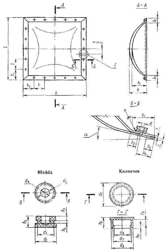 Постановлением Государственного комитета Совета Министров СССР по делам строительства от 9 августа 1976 г. № 130 срок введения установлен с 01.01. 1978 г. Несоблюдение стандарта преследуется по закону Настоящий стандарт распространяется на двуслойные купола из органического стекла, изготовляемые способом пневматического формования их оболочек и сваркой оболочек по контуру купола. Купола предназначаются для заполнения световых проемов зенитных фонарей, применяемых для устройства естественного освещения в промышленных зданиях. 1. ТИПЫ И РАЗМЕРЫ1.1. Купола могут изготавливаться двух типов: 1 - купола с шайбами по контуру и защитными колпачками, устанавливаемые на деревянные опорные элементы; 2 - купола без шайб, устанавливаемые на деревянные или металлические опорные элементы. 1.2. Форма, размеры куполов и их элементов, колпачков, расположение шайб должны соответствовать указанным на черт. 1-2 и в таблице. 1.3. Допускаемые отклонения размеров куполов не должны превышать в мм: по длине и ширине ± 5 по высоте верхней и нижней оболочек ±10 по ширине опорной площадки ± 5 диаметра отверстий в опорной площадке +1 по ширине сварных швов ± 2 1.4. Допускаемое отклонение от угла наклона опорной площадки купола не должно превышать 1°. Купол типа 1 Черт. 1