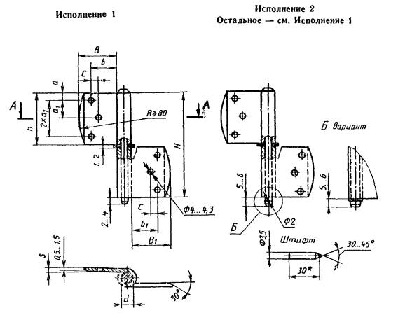 Пример условного обозначения петли накладной типа ПН1 высотой 110 мм, правой: ПН1-110 П ГОСТ 5088-94 То же, врезной типа ПВ4 высотой 90 мм, исполнения 1: ПВ4-90-1 ГОСТ 5088-94 4. ТЕХНИЧЕСКИЕ ТРЕБОВАНИЯ4.1. Петли должны изготовляться в соответствии с требованиями ГОСТ 538 и настоящего стандарта. 4.2. Петли типов ПН1-ПН4, ПН6, ПН10 и ПВ1 следует изготовлять правыми и левыми для установки правых и левых створок окон и полотен дверей (на рисунках Б1 - Б4, Б6, Б10, Б11 приложения Б указаны правые петли). 4.4. Овальность осей и полуосей в местах подвижных соединений с картами не должна быть более 0,1 мм, а трубок карт петель - 0,3 мм. 4.6. Отклонение от перпендикулярности опорных поверхностей осей петель ПН1 - ПН4 и ПВ1 относительно осей вращения не должно быть более 0,25 мм. 4.8. Продольный и поперечный люфт в шарнирах петель типов ПН8 и ПН9 не должен быть более 0,3 мм. Для петель применяют пружины кручения по техническим условиям завода-изготовителя, утвержденным в установленном порядке. Оси петель всех типов, кроме типов ПН5, ПН8 - ПН10 и ПВв1 - ПВв3, должны иметь на торце фаску (2 - 3)´30°. 4.13. Карты петель типов ПН1, ПН3, ПН5, ПН6 и ПН8 по согласованию с потребителем допускается изготовлять прямоугольной формы. 4.15. Петли исполнения 2 типов ПН7, ПВ2 - ПВ4 необходимо комплектовать шплинтами 2´16 по ГОСТ 397 или быстросъемными упорными шайбами 5-080 по ГОСТ 11648. 4.16. Требования к покрытиям петель - по ГОСТ 538. Для петель в соответствии с областью их применения установлены следующие группы условий эксплуатации по ГОСТ 9.303: 1 - для петель типов и типоразмеров ПН1-70, ПН1-85, ПН1-110, ПН2-70, ПН2-85, ПН2-110, ПН3-85, ПН4, ПН5, ПН6, ПН7, ПВ1, ПВ2, ПВ3, ПВ4, ПВв1, ПВв2, ПВв3; 2, 3 - для петель типов и типоразмеров ПН1-130, ПН1-150, ПН2-130, ПН2-150, ПН3-110, ПН3-130, ПН3-150, ПН8, ПН9, ПН10. 4.17 Маркировка и упаковка - по ГОСТ 538. 5. ПРИЕМКА5.1. Приемочный контроль петель на соответствие требованиям ГОСТ 538 и 4.3 - 4.10, 4.12, 4.15 настоящего стандарта проводится в соответствии с ГОСТ 538. Значительными дефектами считают дефекты, относящиеся к отклонениям от требований, указанных в ГОСТ 538 и 4.10 настоящего стандарта. Малозначительными дефектами считают дефекты, относящиеся к отклонениям от требований, указанных в ГОСТ 538 и 4.3 - 4.9, 4.12, 4.15 настоящего стандарта. 5.2. Периодические испытания ввертных петель на соответствие требованиям 4.14 и петель типов ПН8 и ПН9 на соответствие требованиям 4.11 должны проводиться не реже одного раза в год. Для проведения испытаний отбирают не менее трех петель. 5.3. Типовые испытания - по ГОСТ 538. 6. МЕТОДЫ КОНТРОЛЯ6.1. Методы контроля и испытаний петель - по ГОСТ 538 и настоящему стандарту. 6.2. Испытания ввертных петель на отрыв проводят приложением силы 800 Н (80 кгс) в течение не менее 1 мин. к каждому стержню петли. После испытаний петля должна сохранить работоспособность. 6.3. Испытания петель типов ПН8 и ПН9 по 4.11 проводят приложением силы не менее 2 и не более 4 кгс на расстоянии 700 мм от оси петли к фрагменту двери с установленной на нем петлей и выдерживанием приложенной силы в течение 1 мин. После снятия приложенной силы петля должна вернуть фрагмент двери в исходное положение. 7. ТРАНСПОРТИРОВАНИЕ И ХРАНЕНИЕТранспортирование и хранение - по ГОСТ 538. 8. ГАРАНТИИ ИЗГОТОВИТЕЛЯГарантии изготовителя - по ГОСТ 538. ПРИЛОЖЕНИЕ А(Информационное) ОБЛАСТЬ ПРИМЕНЕНИЯ ПЕТЕЛЬТаблица А1