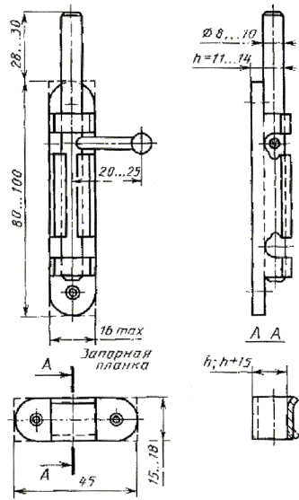 Черт. 8 Шурупы 1-4´25 или 1-3´25 по ГОСТ 1145-80 (2 шт.) винты ВМ4-6q´35.36 ГОСТ 17474-80 (2 шт.). Пример условного обозначения завертки исполнения 1 правого исполнения с ручкой типа Р1: ЗРЗ-1-П-1 ГОСТ 5090-86 То же, исполнения 2 левого исполнения с ручкой типа Р2 и накладкой: ЗРЗ-2-Л-2 ГОСТ 5090-86 Завертка врезная типа ЗР4 Черт. 9 (Поправка. ИУС 4-1988). Примечание. Форма и размеры засова могут быть аналогичными засову заверток типов ЗР2, ЗР3. (Поправка. ИУС 5-1988). Шурупы 1-4´25 или 1-3´25 по ГОСТ 1145-80 (2 шт.) и штифты (2 шт.). Примечание. Отверстия диаметром 4,3 мм следует располагать на оси симметрии корпуса завертки. (Поправка. ИУС 1-1988). Пример условного обозначения завертки с ручкой типа Р1: ЗР4-1 ГОСТ 5090-86 Завертка накладная типа ЗФ1 Черт. 10 (Поправка. ИУС 1-1988). Шурупы 1-4´30 по ГОСТ 1145-80 или ГОСТ 1146-80 (4 шт.). Примечание. Допускается располагать шурупы на корпусе завертки в пределах 45° от вертикальной оси. Пример условного обозначения завертки с запорной планкой исполнения 1: ЗФ1-1 ГОСТ 5090-86 Завертка накладная типа ЗФ2 Черт. 11 (Поправка. ИУС 4-1988). Шурупы 1-3´20 по ГОСТ 1145-80 или ГОСТ 1146-80 (4 шт.). Пример условного обозначения завертки правого исполнения: ЗФ2 П ГОСТ 5090-86 То же, исполнения 2: ЗФ2 П-2 ГОСТ 5090-86 Задвижка накладная типа ЗТ Черт. 12 Шурупы 1-3´25 или 1-4´25 по ГОСТ 1145-80 (4 шт.). Пример условного обозначения задвижки для створок с наплавом: ЗT (h + 15) ГОСТ 5090-86 То же, без наплава: ЗT (h) ГОСТ 5090-86 (Поправка. ИУС 1-1988). Черт. 13 Винт ВM6-6q´55.86 по ГОСТ 17473-80, ГОСТ 17474-80 или ГОСТ 17475-80. (Поправка. ИУС 1-1988). Шурупы 1-3´25 по ГОСТ 1145-80 (2 шт.). Пример условного обозначения стяжки: СТ ГОСТ 5090-86 3. Технические требования, комплектность, правила приемки, методы контроля, маркировка, упаковка, транспортирование, хранение и гарантийный срок эксплуатации запирающих изделий должны соответствовать ГОСТ 538-78 и дополнительным требованиям настоящего стандарта. 4. Завертки-стяжки типа ЗР1 допускается изготавливать до 01.01.90. 5. Завертки типа ЗР4 предназначены для комплектования окон и балконных дверей, изготовляемых на автоматизированных линиях, установленных на деревообрабатывающих комбинатах до 01.01.86. 6. Засовы врезных шпингалетов и заверток в открытом положении не должны выступать над лицевой поверхностью планок или западать внутрь корпуса более чем на 1 мм. 7. Размеры засова и запорной планки шпингалетов типов ШН1, ШН2 и задвижки типа ЗТ должны обеспечивать при их соединении натяг не менее 3 мм. Толщина запорных планок указанных изделий не должна быть менее 1 мм. (Поправка. ИУС 2-1990). (Поправка. ИУС 9-1990). 8. Шнур фрамужного прибора типа ПФ2 должен перемещаться по роликам свободно, без заеданий и не соскальзывать с них. 9. Завертки типов ЗР1, ЗР2, ЗР4 и ЗФ1 следует изготавливать двухсторонними, типов ЗРЗ и ЗФ2 - в правом и левом исполнениях. 10. Засов задвижки типа ЗТ должен быть выполнен из стального прутка. 11. Форма ручек, накладок, сечения засовов накладных шпингалетов, а также заостренной части штифтов для заверток стандартом не устанавливаются. 12. Запирающие изделия должны иметь защитное или защитно-декоративное покрытие по ГОСТ 538-78 для 2, 3 или 4 (С) групп условий эксплуатации ГОСТ 9.303-84. 13. Засовы-штанги накладных шпингалетов следует испытывать на прочность при приемочных и типовых испытаниях. Испытания проводят на стенде путем приложения в течение 1 мин к закрепленному засову-штанге силы 800 Н (78,4 кгс) на расстоянии 5 мм от места крепления перпендикулярно к плоско