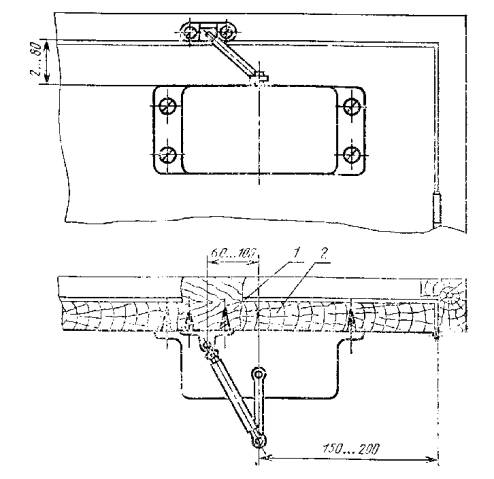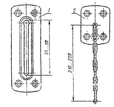 1 - запорная планка; 2 - основание Примечание: Допускается крепить основание цепочки тремя шурупами. (Измененная редакция. Изм. № 2) Шурупы 1-4 ´ 30 (8 шт.) по ГОСТ 1145-80 или ГОСТ 1146-80. (Измененная редакция. Изм. № 2) Условное обозначение: ЦД ГОСТ 5091-78 Упор дверной типа УД1
