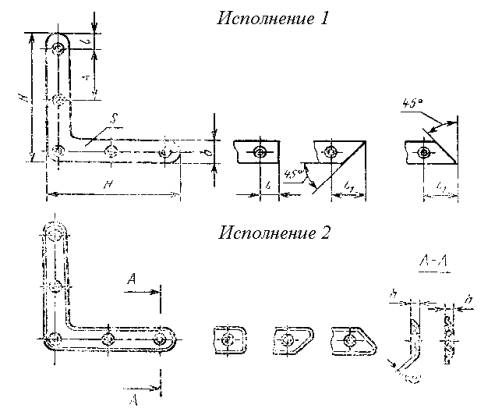 Примечание. Угольники типов УГ75, УГ100 и УГ125 допускается изготовлять с четырьмя отверстиями. Пример условного обозначения угольника стороной Н = 50 мм, исполнения 1: УГ50-1 ГОСТ 5091-78 Нагель типа НГ