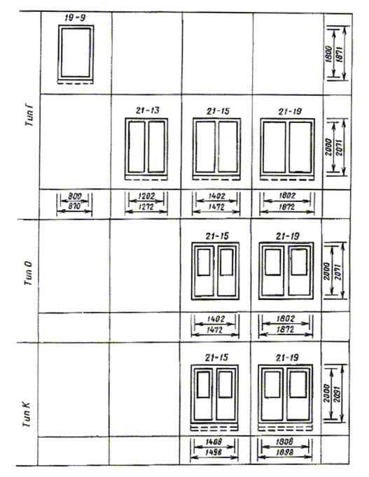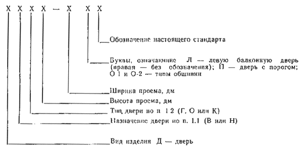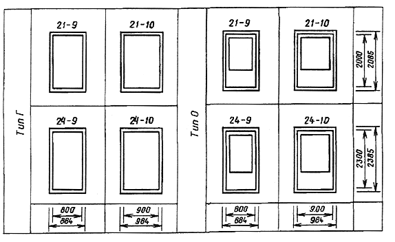 Примеры условных обозначений Дверь внутренняя, глухая, для проема высотой 19 и шириной 9 дм, с правой навеской полотна, с порогом: ДВГ 19-9 П ГОСТ 14624-84 То же, с левой навеской полотна: ДВГ 19-9 ЛП ГОСТ 14624-84 То же, наружная, остекленная, для проема высотой 21 и шириной 9 дм, с левой навеской полотна, с порогом: ДНО 21-9 ЛП ГОСТ 14624-84 То же, наружная, с качающимися полотнами, для проема высотой 21 и шириной 15 дм, типом обшивки Р1: ДНК 21-15 Р1 ГОСТ 14624-84 Типы и размеры внутренних дверей Черт. 1 Типы и размеры наружных дверей Черт. 2 Примечание к черт. 1 и 2. Над схемами дверей указаны координационные размеры высоты и ширины в модулях. Размеры полотен внутренних дверей мм