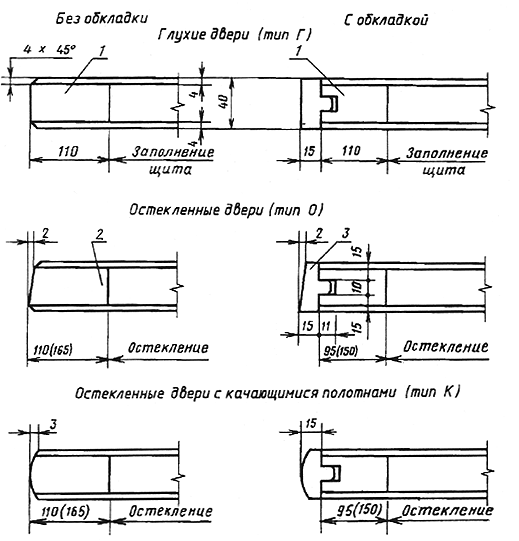 Дата введения 01.07.85 Настоящий стандарт распространяется на деревянные внутренние и наружные двери для производственных зданий промышленных и сельскохозяйственных предприятий. Стандарт не распространяется на двери специального исполнения (трудносгораемые, несгораемые, звукоизолирующие). 1. ТИПЫ И РАЗМЕРЫ1.1. В зависимости от назначения двери подразделяют на: В - внутренние; Н - наружные. 1.2. В зависимости от конструкции двери подразделяют на типы: Г - с притвором в четверть, с глухими полотнами; О - то же, с остекленными полотнами; К - с остекленными качающимися полотнами. 1.3. Двери типа В изготовляют щитовыми со сплошным или мелкопустотным (решетчатым) заполнением дверных полотен. 1.4. Двери типа Н изготовляют со сплошными щитовыми или рамочными полотнами. Щитовые полотна допускается изготовлять без обшивки или с реечной обшивкой. Двери типа Н относят к изделиям повышенной влагостойкости. 1.5. Двери типов Г и О изготовляют правыми и левыми, с порогом и без порога. Двери типа К изготовляют только двупольными остекленными. 1.6. Типы и размеры дверных блоков должны соответствовать указанным на черт. 1 и 2. Допускается изготовление дверей с габаритными размерами в модулях по ГОСТ 6629-88 и ГОСТ 24698-81 при конструктивном исполнении по настоящему стандарту. 1.7. Размеры полотен и коробок внутренних дверей, форма, размеры элементов и сечений их деталей должны соответствовать указанным на черт. 3, 5, 7, 8, а наружных - на черт. 4, 6, 9 - 11. Размеры проемов приведены в приложении 1. 1.8. Устанавливают следующую структуру условного обозначения дверей:
