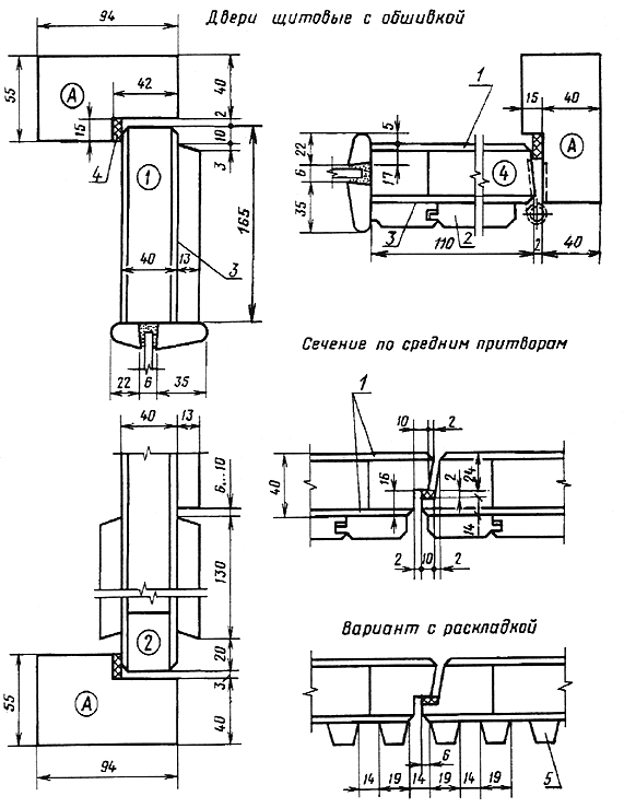 Черт. 6 Примечание. Сечения полотен - на черт. 9 - 11. Сечения по притворам внутренних дверей 1 - пружинная петля ППД по ГОСТ 5088-78; 2 - монтажная доска Черт. 7 Сечения по средним притворам внутренних дверей Нащельники показаны для правой двери, для левой - в зеркальном изображении Сечения элементов полотен по кромкам внутренних и наружных дверей Каркас должен быть собран на сквозной открытый шип. Черт. 8 Сечения деталей наружных дверей 1 - уплотняющая прокладка по ГОСТ 10174-72; 2 - облицовка ДВП, СТ-500 по ГОСТ 4598-86; 3 - рейка 12´12 мм; 4 - прокладка из резины толщиной 2 мм; 5 - шуруп 1-3´30 по ГОСТ 1144-80, шаг 200 мм; 6 - монтажная доска Черт. 9 Сечения по средним притворам