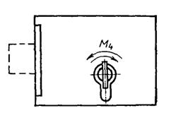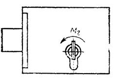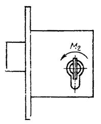 Примечания: 1. Сборочные единицы замка должны выдержать указанные величины наработки (в том числе при приложении нагрузки к боковой поверхности засова) от вращения ключа с каждой стороны цилиндрового механизма, а для цилиндрового механизма с постоянным ключом - от вращения ключа и постоянного. ключа. 2. Допускается раздельное проведение испытаний сборочных единиц по операциям, являющимся частью цикла работы. Измененная редакция (Изм. №1). 4.1.2. При проведении испытаний допускается замена ключа, взятого из комплекта испытываемого замка. 4.1.3. Сборочные единицы необходимо подвергать визуальному осмотру через каждые 30-35 % количества циклов, указанных в табл.1, и, в случае необходимости, смазке. 4.2. Испытания замков и защелок на прочность 4.2.1. Замки и защелки испытывают на прочность силой Р1, Р6 и моментов сил М1, М2 и М3 к их сборочным единицам в соответствии со схемами, указанными на черт. 1-6.