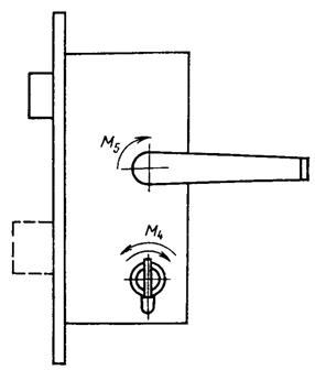 Измененная редакция (Изм. №1). 4.2.2. Сборочные единицы засова, защелкивающего засова и запорную планку испытывают приложением силы P1м = 4900 H (500 кгс) и Р6 = 785 Н (80 кгс) в течение не менее 1 мин. Испытание сборочных единиц силой Р1 = 2940 Н (300 кгс) допускается до 01.04.94. Измененная редакция (Изм. №1). 4.2.3. Сборочные единицы защелки испытывают моментом силы М1 = 15 Н×м (1,5 кгс×м) к фалевой ручке или ручке-кнопке в течение 1 мин. При этом защелка должна быть полностью введена в корпус защелки. 4.2.4. Ключ испытывают приложением момента силы М2 = 2 Н×м (0,2 кгс×м) в течение 1 мин при полностью выведенном засове (засове-защелке). 4.2.5. Перед испытанием замков по п.4.2.2 засов или засов-защелка должен быть полностью выведен из корпуса замка вращением ключа. Измененная редакция (Изм. №1). 4.2.6. Сборочные единицы предохранителя накладного замка испытывают приложением возрастающего по времени момента силы М3. Перед началом испытаний засов или засов-защелку, а также защелку в выведенном положении из корпуса ставят на предохранитель. Испытания прекращают при деформации или поломке ключа (постоянного ключа). 4.3. Определение эксплуатационных усилий замков и защелок 4.3.1. Эксплуатационные усилия замков и защелок определяют измерением сил Р2, Р3, P4 и моментов сил М4, M5, прикладываемых к их сборочным единицам в соответствии со схемами, указанными на черт. 7-12.