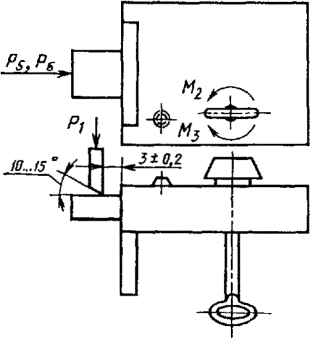 Измененная редакция, (Изм. № 1). Примечания: 1. Допускается раздельное проведение испытаний сборочных единиц по операциям, являющимися частью цикла работы. 4.2.2. При проведении испытаний допускается замена ключа, взятого из комплекта испытываемого замка для продолжения испытаний. 4.2.3. Сборочные единицы необходимо подвергать осмотру через каждые 30-35% числа циклов, указанных в таблице, и, в случае необходимости, смазке. 4.3. Испытания замков на прочность 4.3.1. Замок испытывают на прочность приложением сил P1, p5, Р6 и моментов сил M1, М2, М3 к его сборочным единицам в соответствии со схемами, указанными на черт. 1, 1а, 2. Примечание. Индексы обозначений сил и моментов сил, установленные настоящим стандартом, соответствуют индексам обозначений аналогичных сил и моментов сил по ГОСТ 19091-82 для унификации протокола испытаний по п. 5.1 настоящего стандарта. Измененная редакция, (Изм. № 1). Черт. 1 1 - запорная планка накладного замка; 2- запорная планка врезного замка Черт. 1а Черт. 2 Измененная редакция, (Изм. № 1). 4.3.2. К засову, полностью выведенному из корпуса, перпендикулярное его боковой поверхности и к запорной планке прикладывают силу Р1 = 2940 Н (300 кгс) в течение не менее 1 мин. Измененная редакция, (Изм. № 1). 4.3.3. Засов пятикратно выводят и вводят в корпус замка вращением ключа. При выводе засов должен преодолевать силу Р5 = 49 Н (5 кгс), приложенную к его торцу. 4.3.4. К торцу засова, полностью выведенного из корпуса, прикладывают силу Р6 = 785 (80 кгс) не менее 1 мин. Во время проведения испытания засов должен оставаться полностью выведенным из корпуса. 4.3.5. К фалевой ручке прикладывают момент силы М1 = 15 Н×м (1,5 кгс×м) в течение не менее 1 мин. Перед испытанием защелка должна быть полностью введена в корпус поворотом фалевой ручки. 4.3.6. К ключу в направлении, соответствующему выводу засова, прикладывают момент силы М2 =3 Н×м (0,3 кгс×м) в течение не менее 1 мин. Перед испытанием засов должен быть полностью выведен из корпуса. 4.3.7. К ключу накладного замка в направлении, соответствующему вводу засова, прикладывают возрастающий во времени от нулевого значения момент силы М3. Перед испытанием засов, полностью выведенный из корпуса, фиксируют предохранителем. Во время проведения испытания засов должен оставаться полностью выведенным из корпуса. Испытание прекращают при деформации или поломке ключа. 4.4. Каждый испытанный замок должен сохранить работоспособность, его сборочные единицы (за исключением ключей после испытаний по 4.3.7) должны быть без поломок, трещин и деформаций. Работоспособность замка проверяют пятикратно вручную выводом и вводом засова в корпус при помощи ключа, а для накладного замка также постоянным ключом, вводом защелки и фиксатора от руки и защелки при помощи фалевой ручки. 4.5. Определение эксплуатационных усилий замков 4.5.1. Эксплуатационные усилия замка определяют измерением сил Р2, Р3 и моментов сил М4, М5, прикладываемых к его сборочным единицам в соответствии со схемами, указанными на черт. 3-5. Черт. 3 Измененная редакция, (Изм. № 1).