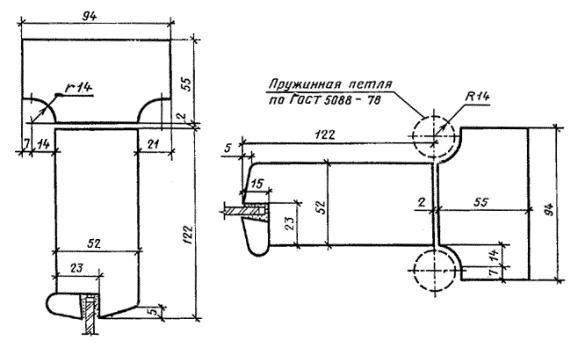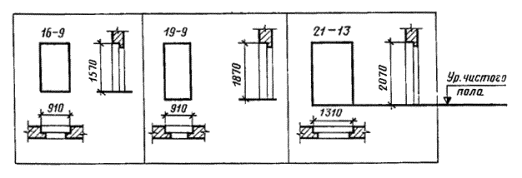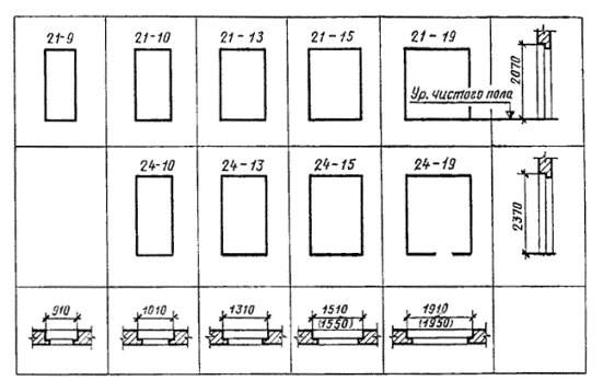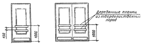 Примеры условных обозначений: дверь входная или тамбурная однопольная для проема высотой 21 и шириной 9 дм, остекленная, с правой навеской щитового полотна, с порогом, с обшивкой типа О-2: ДН21-9 ПЩР2 ГОСТ 24698-81 То же, с левой навеской рамочного полотна: ДН21-9ЛП ГОСТ 24698-81 Дверь входная или тамбурная с качающимися полотнами для проема высотой 24 и шириной 15 дм: ДН24-15К ГОСТ 24698-81 Дверь служебная двупольная глухая, для проема высотой 21 и шириной 13 дм, утепленная: ДС21-13ГУ ГОСТ 24698-81 Люк однопольный для проема высотой 13 и шириной 10 дм: ДЛ13-10 ГОСТ 24698-81 2. ТРЕБОВАНИЯ К КОНСТРУКЦИИ2.1. Двери должны изготовляться в соответствии с требованиями ГОСТ 475 и настоящего стандарта по рабочим чертежам, утвержденным в установленном порядке. 2.2. Конструкция, форма и типоразмеры дверей должны соответствовать указанным на черт. 2 - 5, а размеры сечений - на черт. 6 - 13. 2.3. Полотна щитовых дверей должны изготовляться со сплошным заполнением щита калиброванными по толщине деревянными рейками. Облицовка дверей производится материалами в соответствии с ГОСТ 475 в части, относящейся к дверям повышенной влагостойкости. При условии сплошной обшивки дверей с наружной стороны профилированными рейками по ГОСТ 8242 по слою пергамина по ГОСТ 2697 или обшивки оцинкованной сталью по ТУ на сталь конкретного вида допускается применение твердых ДВП марок Т или Т-П, Т-С, Т-СП по ГОСТ 4598 или клееной фанеры марки ФК по ГОСТ 3916.1 и ГОСТ 3916.2. Тамбурные двери допускается изготовлять без обшивки деревянными рейками. Рейки крепят шурупами по ГОСТ 1144 или гвоздями по ГОСТ 4028 длиной 40 мм с антикоррозийным покрытием. Максимальный шаг креплений - 500 мм. Крепления в каждом ряду должны располагаться на одном уровне по всей ширине полотна. 2.4. Нижние части полотен дверей типа Н должны быть защищены деревянными планками толщиной 16 - 19 мм или полосами из декоративного бумажнослоистого пластика толщиной 1,3 - 2,5 мм по ГОСТ 9590, сверхтвердых ДВП толщиной 3,2 - 4 мм по ГОСТ 4598, тонколистовой оцинкованной стали. Древесные и пластмассовые защитные материалы крепят водостойким клеем и шурупами с антикоррозийным покрытием, а стальные полосы - шурупами длиной 30 - 40 мм по ГОСТ 1144. Шаг крепления по периметру 100 мм. Размеры защитных планок и полос указаны на черт. 6 - 11. 2.5. Полотна и коробки трудносгораемых и утепленных дверей типа С следует защищать тонколистовой оцинкованной сталью толщиной 0,35 - 0,8 мм по ТУ на сталь конкретного вида по всей поверхности с обеих сторон, как указано на черт. 12. Листы стали между собой соединяются в одинарный фальц. 2.6. Полотна трудносгораемых дверей типа С с обеих сторон покрывают слоями асбестового картона толщиной 5 мм по ГОСТ 2850. ГАБАРИТНЫЕ РАЗМЕРЫ ДВЕРЕЙ Примечания: 1. Схемы дверей изображены со стороны фасада. 2. Цифры над схемами дверей обозначают размеры проемов в дециметрах. 3. Размеры в скобках даны для дверей 21-15А, 21-19, 24-15A и 24-19 с качающимися полотнами. 4. Двери 21-9 и 21-13A предусмотрены для одноэтажных зданий и мусороприемных помещений. Черт. 1 КОНСТРУКЦИЯ, ФОРМА И ТИПОРАЗМЕРЫ ДВЕРЕЙ Двери щитовые Сечения деталей см. на черт. 6 - 8. Черт. 2 Двери рамочные