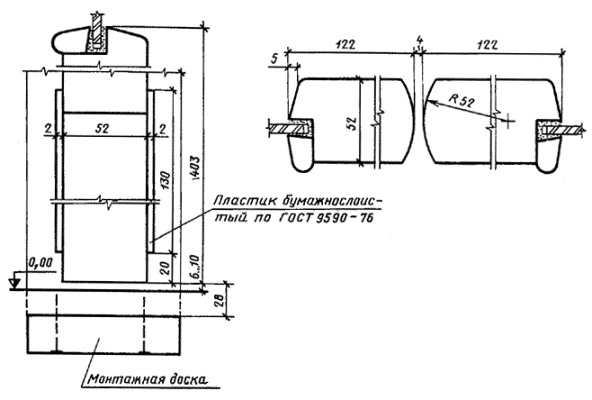 Сечение А2 1 - уплотняющая прокладка по ГОСТ 10174; 2 - облицовка ДВП марок СТ или ТВ толщиной 3,2 - 5 мм по ГОСТ 4598; 3 - рейка (12´12) мм; 4 - прокладка из резины толщиной 2 мм; 5 - шуруп 1-3´30 по ГОСТ 1144, шаг 200 мм; 6 - монтажная доска Примечания: 1. Допускается применение пластмассовых раскладок. 2. Допускается применение монтажных досок иной конструкции. Черт. 6 Сечение A3 Сечение А4