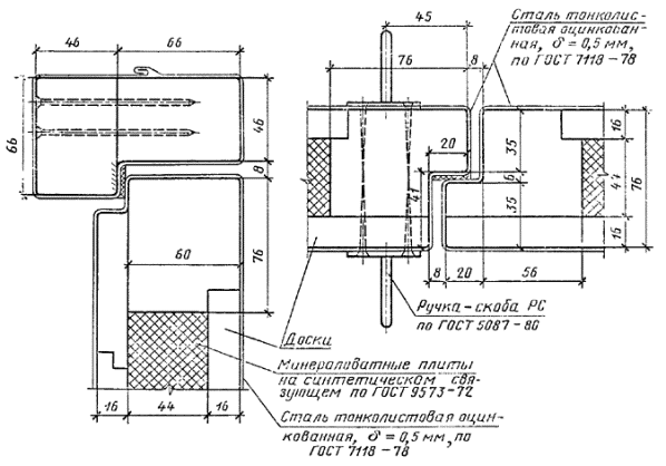 Сечение Е2 Сечение Е4 1 - резиновая прокладка по ГОСТ 7338; 2 - сталь тонколистовая оцинкованная толщиной 0,5 мм; 3 - облицовка ДВП марки СТ или ТВ толщиной 5 мм по ГОСТ 4598; 4 - картон асбестовый по ГОСТ 2850; 5 - мягкая ДВП марки М-1 толщиной 12 мм по ГОСТ 4598; 6 - рейка деревянная (12´30) мм; 7 - шурупы 1-4´40 по ГОСТ 1144, шаг 200 мм Черт. 12 тип л Люки и лазы Сечение Ж1 Сечение Ж3