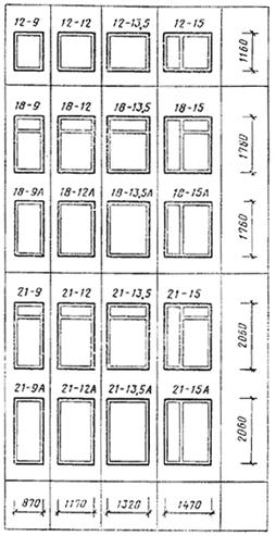 Примечания: 1. Схемы изделий изображены со стороны фасада. 2. Цифры над схемами изделий означают размеры проемов в модулях. 3. Окна талов 15—12; 15—13,5; 15—15; 15—18 и 15—21 — с клапанами. Черт. 1 Габаритные размеры окон и балконных дверей общественных зданий Окна