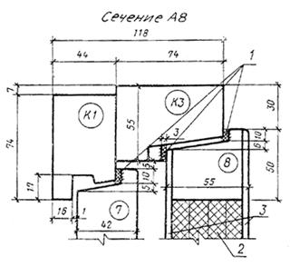1 — уплотняющие прокладки по ГОСТ 10174; 2 — мягкая ДВП толщиной 12 мм, 4 слоя, по ГОСТ 4698 (вариант: допускается заполнение полужесткими минераловатными плитами на синтетическом связующем по ГОСТ 9573); 3 — твердая ДВП толщиной 3,2 мм по ГОСТ 4598 марки Т группы А Черт. 12