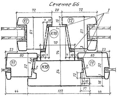 1 — уплотняющие прокладки по ГОСТ 10174; 2 — мягкая ДВП толщиной 12 мм, 3 слоя, по ГОСТ 4598-74 (вариант: допускается заполнение минераловатными полужесткими плитами на синтетическом связующем по ГОСТ 9573); 3 — твердая ДВП марки Т группы А толщиной 3,2 мм по ГОСТ 4598; 4 — мягкая ДВП толщиной 12 мм по ГОСТ 4398; 5 — пергамин по ГОСТ 2697; 6 — обшивка типа О-2 по ГОСТ 8242 Черт. 16