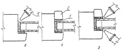 1 — завертка ЗР2—1, ЗР2—2 для наружных створок со съемной ручкой и накладкой; 2 — ограничитель для фрамуг; 3 — ручка PC-80; 4 — ПВ4—90—1; 5 — ПФ2; 6 — ПВ4—90—2; 7 — пв2—200¾1; 8 — ПВ4—60¾1; 9 — пв4—90—2 Примечания: 1. Приборы для окон и дверей должны соответствовать ГОСТ 538, ГОСТ 5087, ГОСТ 5088, ГОСТ 5089, ГОСТ 5090 и ГОСТ 5091. 2. Завертки показаны в открытом положении. 3. Ручки РС80 устанавливают на наружное полотно со стороны балкона. 4. Фрамужный прибор ПФ2 показан условно. 5. Угольники устанавливают в соответствии с п. 2.13 ГОСТ 23166. 6. При ширине фрамуг более 830 мм устанавливают два ограничителя для фрамуг. ПРИЛОЖЕНИЕ 4 Справочное ПОСЛЕДОВАТЕЛЬНОСТЬ ВЫПОЛНЕНИЯ ОПЕРАЦИЙ ПРИ МОНТАЖЕ СТЕКЛОПАКЕТОВ а — наклеить боковые прокладки; б — установить стеклопакет, опорные и распорные прокладки; в — нанести пистолетом слой нетвердеющей герметизирующей мастики вдоль торцов стеклопакета; г — установить боковые прокладки и штапики; д — зазоры уплотнить мастикой