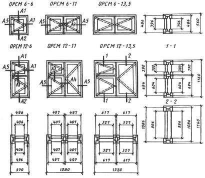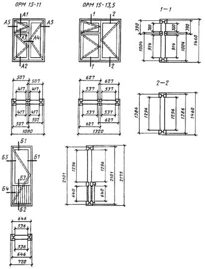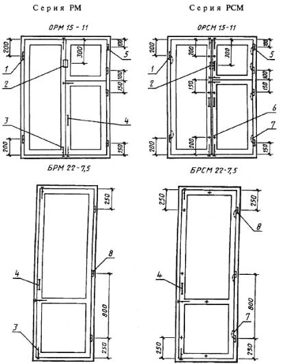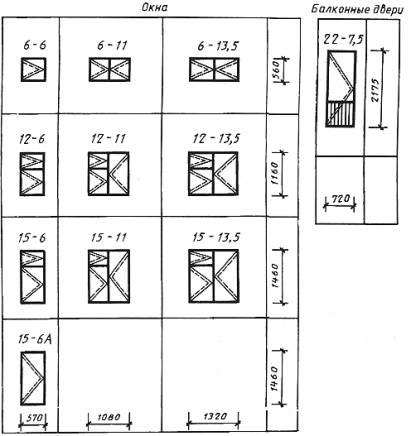 Примечания: 1. Схемы изделия изображены со стороны фасада. 2. Цифры над схемами изделий означают размеры изделий в модулях (М - модуль, равный 100 мм). 3. Окна шириной 1080 мм предназначены для деревянных домов заводского изготовления, выпускаемых по типовым проектам с панелями шириной 1200 мм. Серия РМ Конструкция, форма, основные размеры и марки окон и балконных дверей с двойным остеклением
