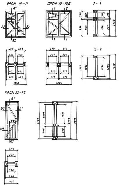 В конце марки окон и балконных дверей с одинарным остеклением перед обозначением стандарта добавляют цифру 1 через тире. Примеры условных обозначенийОкно правое серии РМ высотой 15 и шириной 6 дм (вариант А): ОРМ15-6А ГОСТ 26601-85 То же, левое: ОРМ15-6АЛ ГОСТ 26601-85 Дверь балконная серии РСМ высотой 22 и шириной 7,5 дм: БРСМ22-7,5 ГОСТ 26601-85 Окно серии РМ высотой 12 и шириной 11 дм, с несимметричным рисунком окна: ОРМ12-11 ГОСТ 26601-85 То же, в негативном исполнении: ОРМ12-11Н ГОСТ 26601-85 2. ТРЕБОВАНИЯ К КОНСТРУКЦИИ2.1. Окна и балконные двери должны изготовляться в соответствии с требованиями ГОСТ 23166 и настоящего стандарта по рабочим чертежам, утвержденным в установленном порядке. 2.2. Конструкция, форма, основные размеры и марки окон и балконных дверей серии РМ должны соответствовать указанным на черт.2-4, а размеры сечений деталей и притворов – на черт.5-12. 2.3. Конструкция, форма, основные размеры и марки окон и балконных дверей серии РСМ должны соответствовать указанным на черт.13-15, а размеры сечений деталей и притворов – на черт.16-23. 2.4. Размеры на общих видах окон и балконных дверей даны в свету, по наружным сторонам створок, форточек и полотен дверей и по наружным сторонам коробок. На чертежах, приведенных в настоящем стандарте, указаны в миллиметрах размеры неокрашенных деталей и изделий. 2.5. Для остекления окон и балконных дверей следует применять стекло толщиной 2,0-2,5 мм по ГОСТ 111. 2.6. Места установки уплотняющих прокладок в притворах окон и балконных дверей указаны на чертежах сечений. 2.7. По периметру оконных и дверных коробок на боковых поверхностях допускается по требованию потребителей выборка четверти для уплотнения стыка при соединении блоков друг с другом. 2.8. Бруски коробок допускается изготовлять клееными по ширине или соединять гвоздями после антисептирования или окраски сопрягаемых поверхностей, при этом соединение не должно иметь зазоров и провесов. 2.9. В зданиях для климатических районов, где по теплотехническим расчетам не требуются окна и балконные двери с двойным остеклением, а также в неотапливаемых зданиях и помещениях должны применяться окна и балконные двери серии РМ без внутренних створок, при этом ширина сечения коробки может быть уменьшена до 74 мм. 2.10. Для остекления веранд должны применяться наружные створки окон марок ОРМ 15-6 и ОРМ 15-6А. 2.11. Примеры расположения приборов в окнах и балконных дверях приведены в приложении 1. 2.12. Спецификации стекол для окон и балконных дверей серий РМ и РСМ приведены в приложениях 2 и 3. Типы и габаритные размеры окон и балконных дверей
