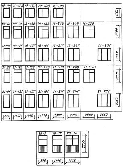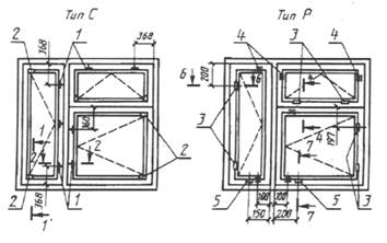 Черт.1 Примечание: Допускается применение окон 13,5 М по ширине. 2. ТРЕБОВАНИЯ К КОНСТРУКЦИИ2.1. Конструкция и основные размеры окон и балконных дверей должны соответствовать: для типа Р - указанным в табл.1 и на черт.2-10; для типа С - указанным в табл.2 и на черт.11-19. 2.2. По согласованию изготовителя с потребителем допускается изготовление окон и балконных дверей с фрамугами в отдельных коробках. 2.3. Конструкция заполнения глухой части полотен балконных дверей должна соответствовать ГОСТ 11214. Допускается применение других конструкций заполнения в зависимости от климатических районов эксплуатации изделий и при условии соблюдения требований СНиП II-3. 2.4. Для отвода дождевой и конденсатной воды в нижних и средних горизонтальных профилях должны быть предусмотрены водоотводящие отверстия или пазы, число которых должно соответствовать ГОСТ 11214. 2.5. Для остекления изделий следует применять стекло толщиной 3-4 мм по ГОСТ 111. Толщину стекла уточняют в проектах с учетом ветровых нагрузок и шумовых воздействий в районе строительства. 2.6. Створки и полотна внутренних деревянных переплетов окон и балконных дверей типов Р и С должны быть навешены на врезные петли с вынимающимися стержнями по ГОСТ 5088. Створки и полотна наружных алюминиевых переплетов изделий типа Р должны быть навешены на специальные алюминиевые петли, обеспечивающие дополнительное крепление к деревянной коробке, а типа С – на внутренние деревянные створки и полотна при помощи петель-шарниров. 2.7. Расположение петель и приборов в изделиях устанавливают в рабочих чертежах, утвержденных в установленном порядке, с учетом требований настоящего стандарта и ГОСТ 11214. 2.8. Габариты проемов окон и балконных дверей в наружных стенах зданий должны соответствовать габаритам проемов, принятым в ГОСТ 11214. 2.9. Места установки уплотняющих прокладок в притворах деревоалюминиевых окон и балконных дверей указаны на черт.2-19. 2.10. По требованию потребителя деревоалюминиевые окна и балконные двери должны комплектоваться нащельниками, сливами, элементами для блокировки (комплектующие изделия), изготовляемыми по рабочим чертежам, утвержденным в установленном порядке. Вид и цвет защитно-декоративного покрытия алюминиевой и деревянной части изделия, а также дополнительные требования определяют по согласованию изготовителя с потребителем. 2.11. Примеры расположения приборов на алюминиевых переплетах в деревоалюминиевых окнах и балконных дверях приведены в приложении. Таблица 1 Конструкция и основные размеры окон и балконных дверей с наружным алюминиевым переплетом Тип Р
