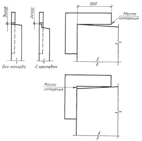3. АППАРАТУРАПри проведении испытания применяют: 1) измерители длины с погрешностью измерения ± 0,5 мм или калибры предельные, соответствующие размерам дверей; 2) штангенциркули по СТ СЭВ 704-77, СТ СЭВ 707-77 и СТ СЭВ 1309-78; 3) угольник плоский 90° с плечом длиной 500 мм с погрешностью измерения ± 10¢; 4) щупы плоские. 4. ПРОВЕДЕНИЕ ИСПЫТАНИЯ4.2. Толщину измеряют штангенциркулем в шести точках, расположенных в середине ширины и на каждой одной трети высоты на расстоянии не более 20 мм от краев створки. Измерение толщины производят с погрешностью ± 0,1 мм. 4.3. Прямоугольность измеряют при помощи угольника, который прикладывают поочередно к каждому углу дверной створки и плоских щупов. Отклонением от прямоугольности считают измеренную величину зазора между створкой и угольником на расстоянии 500 мм от угла створки в соответствии с чертежом. При угле более 90° измерение зазора производят в вершине угла. Измерение отклонений от прямоугольности производят с погрешностью ± 0,1 мм.