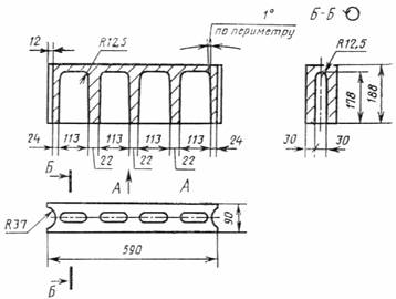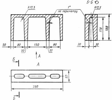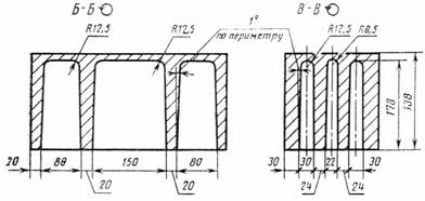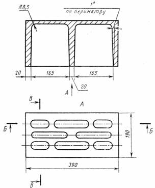 Черт. 1 Продольная половинка Черт. 2 Перегородочный камень Черт. 3 1.2. Основные типы, размеры и справочная масса бетонных стеновых камней должна соответствовать приведенным в табл. 1 и на черт. 1-3. Допускается изготовление камней размерами 410´200´200; 288´288´138 и 288´138´138 мм. По согласованию с потребителем и базовой организацией по стандартизации пустотелые камни допускаются изготовлять с другим числом, расположением и формой пустот при условии обеспечения средней плотности камней не более указанных в п. 1.7. 1.3. Толщина наружных стенок пустотелых камней не должна быть менее 20 мм. Толщина горизонтальной диафрагмы в наиболее тонкой части не должна быть менее 10 мм. 1.4. По прочности на сжатие камни подразделяют на марки: 200, 150, 125, 100, 75, 50, 35, 25. 1.5. По морозостойкости камни подразделяют на марки: Мрз 50, Мрз 35, Мрз 25 и Мрз 15. Морозостойкость перегородочных камней и камней на гипсовом вяжущем не регламентируют. 1.6. Камни подразделяют на рядовые (Р) и лицевые (Л). Лицевые камни изготовляют с неокрашенными или окрашенными лицевыми поверхностями с маркой по прочности на сжатие не менее 75, по морозостойкости не менее 25. 1.7. Средняя плотность пустотелых камней не должна быть более 1650 кг/м3, а полнотелых камней 2200 кг/м3. 1.8. По средней плотности и теплопроводности камни подразделяют на эффективные - плотностью до 1400 кг/м3, условно-эффективные - плотностью от 1401 до 1650 кг/м3 и тяжелые - плотностью более 1650 кг/м3. Теплопроводность некоторых видов легких бетонов, а также эффективных и условно-эффективных камней (типов СКЦ, СКИ и СКШ), используемых при кладке наружных стен, приведена в табл. 1-3 справочного приложения 1. 1.9. Масса одного камня не должна быть более 31 кг. 1.10. В зависимости от типов, марок, плотности и морозостойкости бетонным камням присваивают условные обозначения. Пример условного обозначения стенового бетонного лицевого камня на цементном вяжущем, размером 390´190´188 мм, марки 125, плотностью 1600 кг/м3, морозостойкостью Мрз 25: СКЦ-1Л 125/1600/25 ГОСТ 6133-84 То же, рядового, па известковом вяжущем, размером 390´90´188, марки 75, плотностью 1500 кг/м2, морозостойкостью Мрз 15 СКИ-1Р 75/1500/15 ГОСТ 6133-84 То же, рядового, на гипсовом вяжущем, размером 410´215´190 мм, марки 75, плотностью 1300 кг/м3: СКГ-2Р 75/1300 ГОСТ 6133-84 2. ТЕХНИЧЕСКИЕ ТРЕБОВАНИЯ2.1. Стеновые бетонные камни изготавливают в соответствии с требованиями настоящего стандарта по технологическому регламенту, утвержденному в установленном порядке. 2.2. Отклонения от номинальных размеров камней и показателей их внешнего вида не должны превышать указанных в табл. 2.