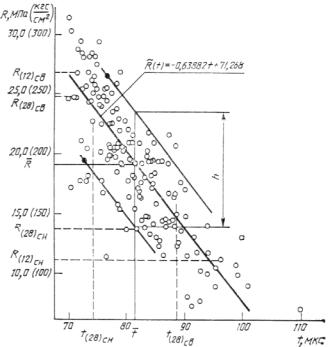 где Ri - прочность i-го изделия, МПа, определенная по ГОСТ 8462-85; ti - время распространения ультразвука в i-м изделии, мкс; n ³ 100 - число изделий (образцов);