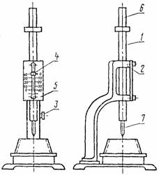Дата введения 01.01.78 Настоящий стандарт распространяется на все виды цемента и устанавливает методы испытаний для определения нормальной густоты, сроков схватывания цементного теста, а также равномерности изменения объема цемента. 1. ОПРЕДЕЛЕНИЕ НОРМАЛЬНОЙ ГУСТОТЫ ЦЕМЕНТНОГО ТЕСТАПрибор Вика с иглой и пестиком. Кольцо к прибору Вика. Мешалка для приготовления цементного теста. 1.1.1. Прибор Вика (черт. 1) имеет цилиндрический металлический стержень 1, свободно перемещающийся в обойме станины 2. Для закрепления стержня на требуемой высоте служит стопор-нос устройство 3. Стержень снабжен указателем 4 для отсчета перемещения его относительно шкалы 5, прикрепленной к станине. Шкала имеет цену деления 1 мм. При определении нормальной густоты цементного теста в нижнюю часть стержня вставляют металлический цилиндр-пестик 6. При определении сроков схватывания пестик заменяют иглой 7. Пестик должен быть изготовлен из нержавеющей стали с полированной поверхностью. Игла должна быть изготовлена из стальной жесткой нержавеющей проволоки с полированной поверхностью и не должна иметь искривлений. Поверхность пестика и иглы должна быть чистой. Прибор Вика
