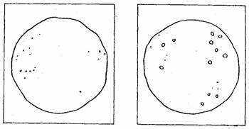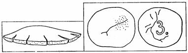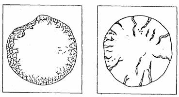 3.2. Проведение испытаний 3.2.1. Для испытания на равномерность изменения объема цемента готовят тесто нормальной густоты согласно п.п. 1.2.4 и 1.2.5. Две навески теста массой 75 г каждая, приготовленные в виде шариков, помещают на стеклянную пластинку, предварительно протертую машинным маслом. Постукивают ею о твердое основание до образования из шариков лепешек диаметром 7-8 см и толщиной в середине около 1 см. Лепешки заглаживают смоченным водой ножом от наружных краев к центру до образования острых краев и гладкой закругленной поверхности. 3.2.2. Приготовленные по п. 3.2.1 лепешки хранят в течение (24±2) ч с момента изготовления в ванне с гидравлическим затвором, а затем подвергают испытанию кипячением. 3.2.3. По истечении времени хранения по п. 3.2.2. две цементные лепешки вынимают из ванны, снимают с пластинок и помещают в бачок, с водой на решетку. Воду в бачке доводят до кипения, которое поддерживают в течение 3 ч, после чего лепешки в бачке охлаждают и производят их внешний осмотр немедленно после извлечения из воды. 3.2.4. Цемент соответствует требованиям стандарта в отношении равномерности изменения объема, если на лицевой стороне лепешек не обнаружено радиальных, доходящих до краев, трещин или сетки мелких трещин, видимых невооруженным глазом или в лупу, а также каких-либо искривлений и увеличения объема лепешек. Искривления обнаруживают при помощи линейки, прикладываемой к плоской поверхности лепешки, при этом обнаруживаемые искривления не должны превышать 2 мм на краю или в середине лепешки. Допускается в первые сутки после испытаний появление трещин усыхания, не доходящих до краев лепешек, при условии сохранения звонкого звука при постукиваний лепешек одна о другую. Образцы лепешек, выдержавших и не выдержавших испытание на равномерность изменения объема, приведены на черт. 8. 3.2.5. В случае, когда содержание оксида магния MgО в клинкере, из которого был изготовлен испытуемый цемент, составляет более 5 %, следует дополнительно провести испытание равномерности изменения объема в автоклаве. Это испытание проводят только для цементов, выдержавших испытание по п. 3.2.3. Лепешку из теста, приготовленную по п. 3.2.1 и хранимую по п. 3.2.2, вместо кипячения подвергают обработке в автоклаве по следующему режиму: подъем давления от атмосферного до 2,1 МПа -в течение 60-90 мин, выдержка при давлении 2,1 МПа -в течение 3 ч, снижение давления от 2,1 МПа от атмосферного -около 60 мин. После этого лепешку извлекают из автоклава, охлаждают до температуры помещения и немедленно ее осматривают. Лепешки, выдержавшие испытания на равномерность изменения объема