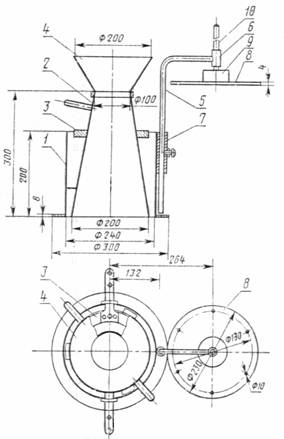2.3. Цилиндрическое кольцо 1, конус 2 и воронку 4 прибора для определения жесткости изготовляют из листовой стали. Кольцо и конус должны иметь гладкую внутреннюю поверхность, степень шероховатости которой не должна быть более Rz 40 мкм по ГОСТ 2789-73. Диск 8, штангу 10 и шайбу 9 изготавливают из стали. Общая масса диска, штанги и шайбы прибора должна составлять (2750 ± 50) г. Виброплощадка должна иметь устройства, обеспечивающие при испытании жесткое крепление прибора к поверхности стола. Фланец цилиндрического кольца прибора должен плотно прилегать к поверхности стола виброплощадки для предотвращения вытекания цементного теста. Примечание. При использовании виброплощадок с магнитным креплением прибора диск, шайба и штанга должны изготавливаться из не намагничиваемых материалов. Прибор для определения жесткости бетонной смеси 1 - цилиндрическое кольцо с фланцем в основании; 2 - конус; 3 - кольцо-держатель с ручками; 4 - загрузочная воронка; 5 - штатив; 6 - направляющая втулка; 7 - фиксирующая втулка с зажимным винтом; 8 - диск с шестью отверстиями; 9 - стальная шайба; 10 - штанга. Черт. 2 3. ПРОВЕДЕНИЕ ИСПЫТАНИЯ3.1. Определение подвижности бетонной смеси 3.1.1. Подвижность бетонной смеси характеризуется измеряемой в сантиметрах величиной осадки конуса ОК, отформованного из бетонной смеси. 3.1.2. Подвижность бетонной смеси с зернами заполнителя наибольшей крупности до 40 мм включительно определяют на приборе - обычном конусе. Для определения подвижности бетонной смеси с зернами заполнителя наибольшей крупности свыше 40 мм следует использовать увеличенный конус. Допускается использование обычного конуса для бетонной смеси с зернами заполнителя наибольшей крупности свыше 40 мм, если смесь предварительно просеяна через сито с ячейками размером 40 мм. Приведение результатов испытания таких проб к подвижности реального состава бетона производят с помощью градуировочной зависимости, устанавливаемой в соответствии с п.4 приложения 1. 3.1.3. Определение осадки конуса бетонной смеси производят в последовательности, приведенной ниже. Каждый слой уплотняют штыкованием металлическим стержнем: в обычном конусе 25 раз в увеличенном конусе 56 раз Конус во время наполнения и штыкования должен быть плотно прижат к листу. 3.1.3.3. После уплотнения бетонной смеси в конусе воронку снимают, и избыток смеси срезают кельмой вровень с верхними краями конуса. 3.1.3.5. Осадку конуса бетонной смеси определяют, укладывая металлическую линейку ребром наверх конуса и измеряя расстояние от нижней грани линейки до верха бетонной смеси с погрешностью до 0,5 см. 3.1.4. Если после снятия конуса бетонная смесь разваливается и приобретает форму, затрудняющую определение ее осадки, измерение не выполняют и испытание повторяют на новой пробе бетонной смеси, отобранной по ГОСТ 10181.0-81. 3.1.5. Величину осадки конуса бетонной смеси, определенную в увеличенном конусе, приводят к величине осадки обычного конуса умножением величины осадки бетона увеличенного конуса на переводной коэффициент 0,67. 3.1.6. Осадку конуса бетонной смеси определяют дважды. Общее время испытания с начала наполнения конуса бетонной смесью при первом определении и до момента измерения осадки конуса при втором определении не должно превышать 10 мин. на 1 см при ОК на 2 см при ОК = 5-9 см; на 3 см при ОК При большем расхождении результатов опр