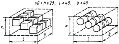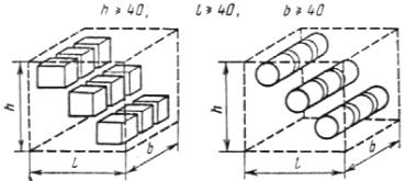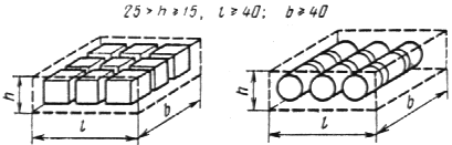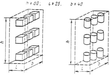 Постановлением Государственного комитета Совета Министров СССР по делам строительства от 9 ноября 1977 г. № 171 срок введения установлен с 01.07.1978 г. Несоблюдение стандарта преследуется по закону 1. Настоящий стандарт распространяется на ячеистый бетон и устанавливает общие требования к методам определения его прочности на сжатие, влажности и объемной массы, усадки при высыхании, морозостойкости, коэффициента паропроницаемости и сорбционной влажности (ГОСТ 12852.1-77 - ГОСТ 12852.6-77). 2. Определение прочности ячеистого бетона на осевое растяжение проводят испытанием образцов-балочек на изгиб по ГОСТ 10180-74. Определение объемной массы бетона радиоизотопным методом проводят по ГОСТ 17623-72, а коэффициента теплопроводности - по ГОСТ 7076-66. 3. Механические и физические показатели ячеистого бетона определяют испытанием серии контрольных образцов. Количество образцов одного размера в серии должно быть не менее трех, форма и номинальные размеры образцов установлены в стандарте на соответствующий вид испытаний. 4. Контрольные образцы (кубы и цилиндры) выпиливают или высверливают из контрольных неармированных блоков, изготовленных одновременно с изделиями из одной и той же бетонной смеси, или же готовых изделий после их остывания. Размеры контрольных блоков должны быть: а) при горизонтальном формовании: по длине и ширине - не менее 40 см; по высоте - равными толщине изделия; б) при вертикальном формовании: по длине - не менее 40 см; по высоте и толщине - равными высоте и толщине изделий. Схема выпиливания образцов (все размеры даны в см) При горизонтальной заливке