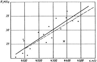 Из каждого намеченного участка в соответствии с ГОСТ 10180 выбуривают и испытывают не менее двух кернов. По данным испытаний кернов определяют значения прочностей Rф.макс, Rф.мин, Rфn в участках, имеющих скорости ультразвука vмакс, vмин, vn.