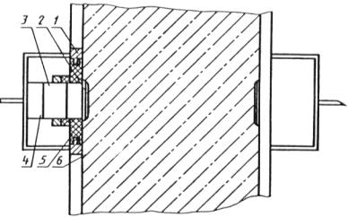 1 - втулка; 2 - рабочая поверхность преобразователя; 3 - ультразвуковой преобразователь; 4 - узел прижима; 5 - акустическая изоляция; 6 - бетон