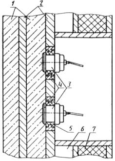 Способы крепления ультразвуковых преобразователей на бортоснастке формы представлены на черт. 6 и 7.