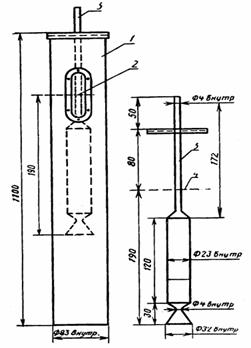 где mв - масса пробы в состоянии естественной влажности, г; m1 - масса пробы после отмучивания, г; W - влажность испытываемой пробы, %. 5.2. Пипеточный метод Содержание пылевидных и глинистых частиц определяют путем выпаривания отобранной пипеткой пробы суспензии, полученной при промывке щебня (гравия), и взвешивания остатка. Настольные гирные или циферблатные весы по ГОСТ 23711 и лабораторные рычажные по ГОСТ 24104. Цилиндрическое ведро с двумя метками (поясами) на внутренней стенке, соответствующими объему 5 и 10 л. Цилиндрическое ведро без меток. Сушильный шкаф по ОСТ 16.0.801.397. Защитное сито с отверстиями размером 3 мм или 5 мм. Контрольное сито с сеткой № 0315 по ГОСТ 6613. Металлические цилиндры вместимостью до 1000 мл со смотровым окном (черт. 4)-2 шт. Мерная металлическая пипетка вместимостью 50 мл (черт. 2). Чашка или стакан для выпаривания по ГОСТ 9147. Пикнометр по ГОСТ 22524. 5.2.2. Проведение испытания Аналитическую пробу щебня (гравия) массой не менее 5 кг в состоянии естественной влажности взвешивают, помещают в ведро (без меток) и заливают 4,5 л воды, оставляя около 500 мл воды для последующего ополаскивания ведра. Залитый водой щебень (гравий) выдерживают в воде 10-15 мин, перемешивая несколько раз деревянной мешалкой, после чего тщательно отмывают его в той же воде от приставших к зернам глинистых частиц. Затем содержимое ведра осторожно выливают на два сита: верхнее-с отверстиями диаметром 3 или 5 мм, нижнее-с сеткой № 0315, поставленные на второе ведро (с метками). Суспензии в ведре с метками дают отстояться и осторожно сливают осветленную воду в первое дерево. Слитой водой вторично промывают щебень (гравий) на ситах над ведром с метками. После этого первое ведро ополаскивают оставленной водой и эту воду сливают также во второе ведро. При этом используют такое количество оставленной воды, чтобы уровень суспензии в последнем не превышал метки 5 л. Если объем суспензии меньше 5 л, то в нее добавляют воду, доводя объем точно до 5 л (до метки). После этого суспензию тщательно перемешивают в ведре и немедленно наполняют ею два металлических цилиндра вместимостью по 1000 мл. Металлический цилиндр и мерная пипетка 1 - цилиндр; 2 - метка на цилиндре 1000 см3; 3 - пипетка; 4 - уровень суспензии в цилиндре Черт. 2 Уровень суспензии в каждом цилиндре должен соответствовать метке на смотровом окне. Суспензию в каждом цилиндре перемешивают стеклянной или металлической палочкой или несколько раз опрокидывают цилиндр, закрывая его крышкой для лучшего перемешивания. После перемешивания оставляют цилиндр в покое на 1,5 мин. За 5-10 с до окончания этого срока в цилиндр опускают мерную пипетку так, чтобы опорная крышка опиралась на верхний обод цилиндра, при этом низ воронки пипетки будет находиться на уровне отбора суспензии-190 мм от поверхности. По истечении 5-10с открывают трубку пипетки, и после ее заполнения снова закрывают трубку пальцем, извлекают пипетку из цилиндра и, открыв трубку, выливают содержимое пипетки в предварительно взвешенную чашку или стакан. Наполнение пипетки контролируют по изменению уровня суспензии в смотровом окне. Суспензию в чашке (стакане) выпаривают в сушильном шкафу при температуре (105±5)°С. Чашку (стакан) с выпаренным порошком взвешивают на весах с погрешностью до 0,1 г. Аналогично отбирают и обрабатывают пробу из второго цилиндра. 5.2.3. Обработка результатов 