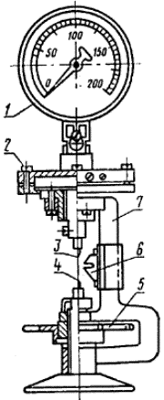 где т-масса аналитической пробы щебня (гравия), г; т1-масса остатка на контрольном сите после просеивания раздробленной в цилиндре пробы щебня (гравия), г. За результат принимают среднее арифметическое значение двух параллельных испытаний. При испытании щебня (гравия), состоящего из смеси фракций, показатель дробимости Др вычисляют в соответствии с п. 1.8. 9. ОПРЕДЕЛЕНИЕ СОДЕРЖАНИЯ ЗЕРЕН СЛАБЫХ ПОРОД В ЩЕБНЕ (ГРАВИИ) И СЛАБЫХ РАЗНОСТЕЙ В ГОРНОЙ ПОРОДЕ9,1. Определение содержания зерен слабых пород Содержание в щебне (гравии) зерен слабых пород определяют путем их выделения по характерным признакам. Настольные гирные или циферблатные весы по ГОСТ 23711 и лабораторные по ГОСТ 24104. Сушильный шкаф по ОСТ 16.0.801.397. Сита из стандартного набора по п. 1.7. Механический индикатор прочности камня типа Т-3 (черт. 5). Минералогическая лупа. Стальная игла по ГОСТ 8030 и алюминиевая игла из проволоки по ТУ 16.1271-088. Молоток. 9.1.2. Подготовка к испытанию От каждой фракции щебня (гравия) берут аналитическую пробу массой по п. 4.2. Полученную пробу высушивают до постоянной массы. Содержание в щебне (гравии) зерен слабых пород определяют отдельно для каждой фракции щебня (гравия). При наличии в испытываемом щебне (гравии) какой-либо фракции в количестве, меньшем 5 % по массе, содержание зерен слабых пород в этой фракций не определяют. Механический индикатор прочности камня (Т-3) 1-манометр; 2-гидравлическая мессдоза; 3-верхний зуб; 4-нижний зуб; 5-щелевой упор; 6-диск винтового механизма; 7-корпус прибора Черт. 5 9.1.3. Проведение испытания Производят разборку пробы каждой фракции щебня (гравия), выделяя зерна слабых пород с пределом прочности при сжатии в насыщенном водой состоянии менее 20 МПа (200 кгс/см2). При выделении зерен слабых пород руководствуются следующими отличительными признаками: зерна слабых пород легко разламываются руками и разрушаются легкими ударами молотка. При царапании иглой на поверхности зерна остается след (на поверхности зерен изверженных и метаморфических пород оставляет след стальная игла, на поверхности зерен осадочных карбонатных пород алюминиевая). Кроме того, слабые зерна карбонатных пород обычно имеют окатанную форму. В целях уточнения содержания зерен слабых пород в щебне допускается использование механического индикатора прочности камня типа Т-3. В зависимости от размера испытываемой фракции щебня устанавливают на приборе сменный щелевой упор с шириной щели 2,9 мм для зерен фракции св. 10 до 20 мм, с шириной щели 4,2 мм для более крупных зерен. При этом расстояние между краем ребер щелевого упора и осью, проходящей через острия зубьев прибора, должно быть равно ширине щели. Каждое выделенное при разборке пробы щебня сомнительное по прочности зерно вставляют клиновидным концом между зубьями прибора до щелевого упора. После этого вращением диска винтового механизма прибора сжимают зубья и «откусывают» кусочек камня. По контрольной стрелке манометра определяют предел прочности камня при растяжении. Шкала манометра градуирована для случая применения упора со щелью шириной 4,2 мм; при применении упора со щелью 2,9 мм показания манометра удваивают. Для перехода от показаний прибора к пределу прочности камня при сжатии предварительно устанавливают переходной коэффициент по данным испытания зерен щебня механическим индикатором Т-3 и определяют про