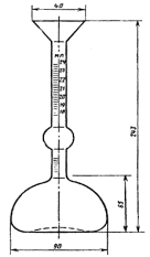 Расхождение между результатами двух определений не должно быть более 0,02 г/см3. В случае больших расхождений производят третье определение и принимают для расчета два ближайших значения. За результат принимают среднее арифметическое значение двух параллельных испытаний. В случае необходимости определения истинной плотности щебня (гравия), состоящего из смеси фракций, ее значение вычисляют по п. 1.8, как среднее взвешенное испытание отдельных фракций. 15.2. Ускоренное определение истинной плотности Истинную плотность горной породы и зерен щебня (гравия) определяют путем измерения массы единицы объема измельченного высушенного материала с использованием прибора Ле-Шателье. Прибор Ле-Шателье (черт. 8). Настольные гирные или циферблатные весы по ГОСТ 23711 и лабораторные по ГОСТ 24104. Стаканчик для взвешивания или фарфоровая чашка по ГОСТ 9147. Эксикатор по ГОСТ 25336. Cyшильный шкаф по ОСТ 16.0.801.397. Серная кислота по ГОСТ 2184. Безводный хлорид кальция по ГОСТ 450. Сито с размером отверстий 5 мм по ГОСТ 6613. Металлическая щетка. 15.2.2. Подготовка к испытанию Пробу готовят по п. 15.1.2. Подготовленную пробу всыпают в стаканчик для взвешивания или в фарфоровую чашку, высушивают до постоянной массы и охлаждают до комнатной температуры в эксикаторе над концентрированной серной кислотой или над безводным хлоридом кальция; После этого отвешивают две навески массой по 50 г каждая. Прибор Ле-Шателье Черт. 8 15.2.3. Проведение испытания Прибор наполняют водой до нижней отметки, причем уровень воды определяют по нижнему мениску. Каждую навеску через воронку прибора всыпают небольшими порциями до тех пор, пока уровень жидкости в приборе, определяемый по нижнему мениску, не поднимется до риски с делением 20 мл (или другим делением) в пределах верхней градуированной части прибора. Для удаления пузырьков воздуха прибор рекомендуется слегка встряхнуть. 15.2.4. Обработка результатов Остаток измельченной пробы
