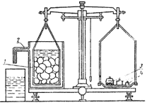 где m-масса высушенной навески порошка, г; m1-масса остатка, г; V-объем воды, вытесненный порошком, см. Расхождение, между результатами двух определений плотности не должно быть больше 0,02 г/см3 В случаях больших расхождений производят третье определение и принимают для расчета два ближайших значения. За результат принимают среднее арифметическое значение двух параллельных испытаний. В случае необходимости определения истинной плотности щебня (гравия), состоящего из смеси фракций, ее значение вычисляют по п. 1.8. 16. ОПРЕДЕЛЕНИЕ СРЕДНЕЙ ПЛОТНОСТИ И ПОРИСТОСТИ ГОРНОЙ ПОРОДЫ И ЗЕРЕН ЩЕБНЯ (ГРАВИЯ)16.1. Определение средней плотности Среднюю плотность горной породы и зерен щебня (гравия) определяют путем измерения массы единицы объема кусков породы или зерен щебня (гравия), который оценивают с использованием весов для гидростатического взвешивания. Настольные гирные или циферблатные весы по ГОСТ 23711-79. Технические весы с приспособлением для гидростатического взвешивания (черт. 9). Сушильный шкаф по ОСТ 16.0.801.397. Сосуд для насыщения щебня (гравия) и образцов водой или для парафинирования образцов. Сита из стандартного набора. Металлическая щетка. 16.1.2. Подготовка к испытанию Для определения средней плотности горной породы отбирают по ГОСТ 23845 пять образцов правильной формы или пять кусков произвольной формы размером св. 40 до 70 мм. Каждый образец очищают металлической щеткой от рыхлых частиц, пыли и высушивают до постоянной массы. Для этой же цели могут быть использованы образцы правильной геометрической формы по п. 1.4, которые также высушивают до постоянной массы. Весы для гидростатического взвешивания 1-сетчатый (перфорированный) стакан; 2-сосуд со сливом для воды; 3-стаканчик с дробью для уравновешивания массы сетчатого стакана в воде; 4-разновесы Черт. 9 Для определения средней плотности зерен щебня (гравия) фракции с наибольшим номинальным размером до 40 мм берут аналитическую пробу массой не менее 2,5 кг. При испытании щебня (гравия) фракции с наибольшим номинальным размером св. 40 мм берут аналитическую пробу, массой около 5 кг зерна крупнее 40 мм дробят до получения частиц размером не более 40 мм и пробу сокращают вдвое. Пробу высушивают до постоянной массы, просеивают через сито с размером отверстий, соответствующим наименьшему номинальному размеру зерен данной фракции щебня (гравия) и из остатка на сите отвешивают две навески по 1000 г каждая. 16.1.3. Проведение испытания Образцы горной породы произвольной формы или навеску щебня (гравия) насыщают водой, погружая их в воду комнатной температуры на 2 ч так, чтобы уровень воды в сосуде был выше поверхности образцов или щебня (гравия) не менее чем на 20 мм. Насыщенные образцы породы или пробу щебня (гравия) вынимают из воды, удаляют влагу с их поверхности мягкой влажной тканью и сразу же взвешивают сначала на настольных гирных или циферблатных, а затем на гидростатических весах, помещая пробу в сетчатый (перфорированный) стакан, погруженный в поду. Образцы горной породы произвольной формы с мелкими открытыми порами вместо насыщения допускается покрывать пленкой парафина толщиной около 1 мм. Для этого высушенный до постоянной массы образец погружают в разогретый парафин и охлаждают на воздухе. В случае обнаружения при остывании на парафиновой пленке пузырьков или повреждений их заглаживают с пом
