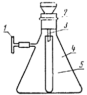 1-водоструйный насос; 2-резиновая пробка; 3-воронка Бюхнера; 4-склянка Бунзена; 5-пробирка для сбора фильтрата Черт. 11 Для ускорения фильтрования используют водоструйный насос со склянкой Бунзена (черт. 11). Фильтрат взбалтывают до получения однородного раствора, отбирают пипеткой 10 мл в мерную колбу объемом 200 мл, доливают до метки дистиллированной водой и перемешивают. Для определения количества растворившегося кремнезема, берут 100 мл раствора, наливают в .фарфоровую чашку, добавляют 5-10 мл концентрированной соляной кислоты и выпаривают на водяной бане. Остаток в чашке увлажняют 5 мл концентрированной соляной кислоты, выдерживают 5-10 мин, добавляют 100 мл горячей дистиллированной воды, перемешивают, выдерживают 10 мин на водяной бане и фильтруют (фильтр белая лента), остаток на фильтре промывают горячей водой до исчезновения реакции на хлориды (при добавлении 1-2 капель раствора нитрата серебра вода должна оставаться прозрачной). Фильтр с осадком помещают в тигель, фильтрат переносят в фарфоровую чашку, выпаривают досуха, и выдерживают в течение 30 мин в сушильном шкафу, при температуре около 105°С. Сухой остаток увлажняют 5 мл концентрированной соляной кислоты, разбавляют водой и фильтруют. Остаток на фильтре промывают до исчезновения реакции на хлориды. Фильтр с осадком помещают в тигель вместе с первым фильтром, подсушивают, оголяют, прокаливают при температуре 1000-1100°С в течение 10 мин и взвешивают. Масса осадка m в тигле соответствует содержанию кремнезема в 100 мл раствора. 22.1.4. Обработка результатов Содержание растворимого кремнезема (М) в миллимолях на 1 л исходного раствора гидроксида натрия определяют по формуле М = т·3300. (42) Горную породу или щебень (гравий) относят к реакционно-способным, если количество растворенного кремнезема в условиях опыта превышает 50 ммоль/л. В этом случае необходима специальная проверка щебня (гравия) в бетоне. 22.2. Фотоколориметрический метод 22.2.1. Аппаратура, реактивы и растворы Аппаратура, реактивы и растворы по п. 22.1.1. Фотоколориметр или спектрофотометр. Мерные колбы вместимостью 100 мл по ГОСТ 1770. Кремневая кислота по ГОСТ 4214. Концентрированная серная кислота плотностью 1,84 г/см3 по ГОСТ 2184. Винная кислота по ГОСТ 5817, 28 %-ный раствор. Раствор молибдата аммония: 89 г молибдата аммония растворяют в 800 мл дистиллированной воды, затем медленно приливают 62 мл серной кислоты плотностью 1,84 г/см3. Раствор охлаждают до 20°С и разбавляют дистиллированной водой до 1 л. Раствор восстановителя: 2,4 г сульфата натрия и 0,2 г эйконогена растворяют в 70 мл дистиллированной воды, добавляют 14 г метабисульфита калия и разбавляют дистиллированной водой до 100 мл. Стандартные растворы: в мерные колбы вместимостью 100 мл помещают от 0,1 до 0,8 мл раствора кремневой кислоты, содержащего 5,2 ммоль/л SiO2. В каждую колбу добавляют 70-80 мл дистиллированной воды, 2,5 мл раствора молибдата аммония, тщательно перемешивают, через 10 мин добавляют 2,5 мл 28 %-ного раствора винной кислоты, тщательно перемешивают. Выдерживают раствор 5 мин, добавляют 2 мл раствора восстановителя и разбавляют дистиллированной водой до метки 100 мл. Определяют оптическую плотность полученных растворов и строят калибровочную кривую зависимости оптической плотности от концентрации SiO2 в растворе, ммоль/л. 22.2.2. Подготовка к испытанию Подготовка к испытанию по п. 22.1.2. 22.2.3. Проведение и