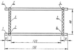 где ц - расход цемента на замес, кг; åк - расход всех компонентов на замес (включая фактически потраченную воду), кг. Фактический расход всех остальных компонентов на 1 м3 уплотненного бетона (песка - П, щебня - Щ5-10, Щ10-20, воды - В) вычисляют по ГОСТ 11051-70. 9. Изготовленные бетонные призмы извлекают из форм через 20±3 ч. Половину из них переносят в камеру для нормального твердения по ГОСТ 11050-64, а вторую половину пропаривают по режиму 5+3+16 ч (подъем температуры до 95±2 °С, выдержка при этой температуре и медленное остывание при отключенной камере). 10. Испытания пропаренных образцов производят через 4 ч после извлечения призм из камер, а образцов нормального твердения - через 28 суток. За время нахождения образцов в помещении лаборатории их подготавливают к испытаниям в соответствии с ГОСТ 11050-64. Помимо этого, боковые грани призм расчерчивают на четыре равные площади тремя линиями, по которым через приспособление (см. чертеж), состоящее из 5-миллиметровых металлических стержней, соединенных пружинами или резинками-продержками, передают усилие, раскалывающее призму на четыре кубика с размерами примерно 10х10х10 см. Схема приспособления для раскалывания бетонной призмы на кубы
