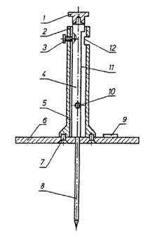 1 — ручка; 2 — втулка; 3 — зажимной винт; 4 — вставка; 5 — корпус; 6 — основание; 7 — крепежный винт; 8 — игла; 9 — табличка; 10 — крепежный винт; 11 — шкала; 12 — стекло Рисунок 2 — Толщиномер 4.7.3 В плите измеряют толщину в пяти местах: в центре и в четырех углах, располагая иглу толщиномера на расстоянии (150 ± 5) мм от смежных краев плиты. 4.7.4 В матах измеряют толщину в четырех углах на расстоянии (150 ± 5) мм от смежных краев, затем через каждый метр длины мата в трех местах по ширине: в двух местах на расстоянии (150 ± 5) мм от краев и один раз по средней линии. Измерение толщины прошивных изделий производят со смещением от указанных выше мест таким образом, чтобы игла толщиномера располагалась между швами. 4.8. Измерение толщины стенок волокнистых цилиндров и полуцилиндров 4.8.1 Измерение изделий производят на опорной трубе при помощи металлической измерительной иглы. Цилиндр или полуцилиндр устанавливают на опорную трубу такого диаметра, который соответствует номинальному внутреннему диаметру цилиндра и полуцилиндра, указанному в таблице 1. Таблица 1 В миллиметрах