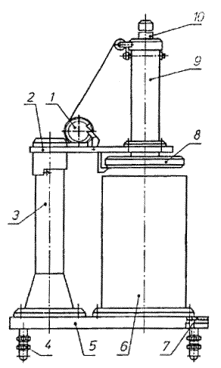 где т4 — масса шнура (образца) с оплеткой, кг; т5 — масса оплетки 1 пог. м шнура, кг/м; l — длина шнура (образца), м; D — диаметр шнура, м. 7.3 Определение плотности рыхлых волокнистых материалов 7.3.1 Метод не распространяется на волокнистые рыхлые материалы плотностью до 40 кг/м3. 7.3.2 Средства контроля Толщиномер проб для определения плотности рыхлых волокнистых материалов (рисунок 3) по технической документации. Весы с пределом допускаемой погрешности взвешивания ± 1 г. Электрошкаф сушильный, обеспечивающий температуру нагрева до 105 °С и автоматическое регулирование температуры с пределом допускаемой погрешности ± 5 °С. 7.3.3 Порядок проведения испытаний При помощи храповика 1 шток прибора 10 (рисунок 3) с диском 8 поднимают в крайнее верхнее положение и поворачивают его влево на 90°. Предварительно взвешенную пробу волокнистого материала массой (500 ± 10) г укладывают горизонтальными слоями в цилиндр 6. Затем кронштейн 2 поворачивают обратно на 90° и при помощи храповика 1 шток 10 с диском 8 опускают в цилиндр 6 на испытуемый материал, при этом освобождается канат храповика 1. Через 5 мин выдержки материала под удельной нагрузкой (2000 ± 30) Па производят с погрешностью не более 0,5 мм отсчет показания толщины пробы по шкале прибора. Пробу удаляют через нижнюю часть цилиндра 6, выдвинув задвижку 7.