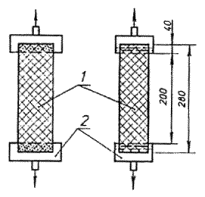 ПРИЛОЖЕНИЕ Е(рекомендуемое) МЕТОД ОПРЕДЕЛЕНИЯ ПРЕДЕЛА ПРОЧНОСТИ НА ОТРЫВ СЛОЕВ МИНЕРАЛОВАТНЫХ И СТЕКЛОВАТНЫХ ПЛИТ В СООТВЕТСТВИИ С ИСО 8145 E.1 Метод распространяется на теплоизоляционные плиты из минеральной и стеклянной ваты на синтетическом связующем. Е.2 Общие требования — в соответствии с разделом 3. Е.3 Сущность метода заключается в измерении растягивающего усилия, вызывающего разрушение образца при заданных условиях испытания. Е.4 Аппаратура, инструменты, материалы Машина разрывная, обеспечивающая растяжение образца со скоростью 9 — 11 мм/мин и позволяющая измерить значение разрушающего усилия с погрешностью не более 1 %. Линейка металлическая по ГОСТ 427. Прибор для измерения толщины (рисунок А4). Мастика битумная по ГОСТ 2889. Две плоских жестких пластины длиной и шириной (200 ± 1) мм. Е.5 Предел допускаемой погрешности измерения линейкой и прибором для измерения толщины — ± 0,5 мм. Е.6 Из плиты вырезают образец в форме параллелепипеда длиной и шириной (200 ± 1) мм и толщиной, равной толщине плиты. Образец вырезают в произвольном месте плиты, но не ближе 50 мм от ее края. Е.7 При помощи битумной мастики приклеивают к образцу две жесткие плоские пластины (рисунок E1). При приклеивании прикладывают давление, величина которого не больше, чем давление, достаточное для хорошего контакта поверхностей пластин и образца. Образец помещают в разрывную машину. Прикладывают к образцу растягивающее усилие при скорости движения активного захвата 9 — 11 мм/мин. Разрушающей считают наибольшую нагрузку, отмеченную при испытании образца в момент его разрушения. Если разрушение образца произошло по приклеивающему слою, то результаты испытания этого образца аннулируют. Е.8 Предел
