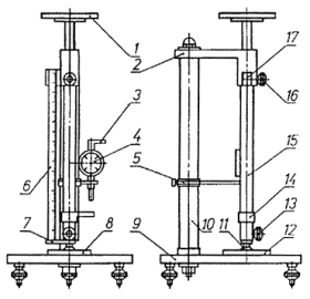 миллиметровой шкале отсчитывают первоначальную толщину образца (h). Затем при помощи держателя 5 индикатор 4 подводят к