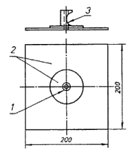 Примечание — Другие измерительные приборы могут быть использованы дли измерения толщины, если пластина прибора имеет форму квадрата со стороной 200 мм и создает удельную нагрузку (50 ± 1,5) Па. 1 — отверстие, диаметр которого достаточен для того, чтобы вставить иглу в направлении, перпендикулярном пластине; 2 — жесткий материал; 3 — канавка для большого пальца; Рисунок А1 — Пластина, создающая заданную удельную нагрузку Рисунок А2 — Игла А.6.3 Мат кладут на плоскую горизонтальную твердую поверхность. Если мат поставляется свернутым в виде рулона, то рулон полностью раскатывают. Отрезают первый и последний 0,5 м рулона, т. к. они не должны подвергаться испытанию. Оставшуюся часть рулона разрезают на куски длиной 1 — 1,5 м. Куски кладут на плоскую горизонтальную твердую поверхность. Если мат имеет обкладку, то его или вырезанные из него куски кладут обкладкой вниз. Мат, который в упакованном виде деформирован так, что его толщина составляет менее 90 % номинальной, должен быть подготовлен к измерению толщины. Процедура подготовки описана ниже: а) берут мат или кусок за длинную сторону и держат вертикально так, чтобы его другая длинная сторона находилась на расстоянии примерно 450 мм от пола; б) роняют мат или кусок на пол; в) повторяют операции а) и б) для мата или куска, предварительно взяв его за другую длинную сторону; г) повторяют операции а), б) и в) для всех кусков, вырезанных из мата. Измерение толщины проводят не раньше, чем через 5 мин после окончания подготовки к измерению. А.6.4 Для проведения измерения пластину медленно кладут на мат или вырезанный из него кусок так, чтобы ее центр совпадал с первой точкой, в которой следует провести измерение толщины. Вращая иглу, прокалывают ею мат или кусок в вертикальном направлении до упора о твердую горизонтальную поверхность, на которой лежит мат или кусок. Прижимают иглу к рукоятке большим пальцем и извлекают ее из мата или куска, держа ее прижатой к пластине. Измеряют расстояние от заостренного конца иглы до пластины с погрешностью не более 1 мм. Это расстояние равно толщине мата или куска в том месте, в котором проведено измерение. А.6.5 Толщину мата или вырезанного из него куска измеряют в четырех точках (рисунок A3). Рисунок A3 — Расположение точек, в которых проводят измерения толщины мата А.6.6 Выраженный в миллиметрах результат каждого измерения толщины округляют до ближайшего целого числа. Вычисляют среднее арифметическое значение округленных результатов четырех измерений толщины. А.6.7 В протоколе испытания указывают среднее арифметическое значение результатов измерения толщины мата. А.7 Измерение толщины плит А.7.1 Толщину измеряют прибором (рисунок А4), в состав которого входят: — плоская жесткая опорная плита 6, имеющая форму квадрата со стороной 300 мм; — жесткая рама 4, укрепленная на этой плите; — индикатор с круговой шкалой 3, цена деления которой 0,1 мм; — верхняя плоская пластина 2, имеющая форму круга диаметром 200 мм и создающая совместно со стержнем индикатора удельную нагрузку (100 ± 3) Па.