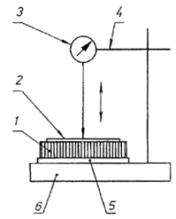 1 — образец; 2 — игольчатый зажим Рисунок 6 — Схема закрепления образца в игольчатых зажимах 16.7 Обработка результатов Предел прочности при растяжении Rраст в мегапаскалях (кгс/см2) вычисляют по формуле Rраст = где Р — разрушающая нагрузка, Н (кгс); b — ширина образца, мм (см); h — толщина образца, мм (см). Результат испытания округляют до 0,01 МПа. 16.8 При проведении сертификации минераловатных и стекловатных матов и плит в соответствии с требованиями ИСО прочность матов при растяжении следует определять по приложению Д, прочность плит на отрыв слоев — по приложению Е. 17 МЕТОД ОПРЕДЕЛЕНИЯ СЖИМАЕМОСТИ И УПРУГОСТИ17.1 Метод распространяется на неорганические волокнистые изделия. 17.2 Общие требования — в соответствии с разделом 3. 17.3 Сущность метода заключается в измерении толщины образца изделия при воздействии сжимающей удельной нагрузки в определенной последовательности. 17.4 Средства испытании Прибор для определения сжимаемости и упругости (рисунок 7) по технической документации. 17.5 Порядок подготовки к испытанию Из изделия изготавливают образец, имеющий в плане форму квадрата со стороной (100 ± 1) мм, толщиной, равной толщине изделия. 17.6 Порядок проведения испытания В исходном