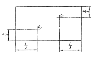 Примечание — Измерение толщины может быть проведено при помощи любого измерительного прибора, часть которого составляет диск диаметром 200 мм, создающий удельную нагрузку (100 ± 3) Па. 1 — образец; 2 — верхняя плоская пластина, имеющая форму круга; 3 — индикатор перемещения с круговой шкалой; 4 — жесткая рама; 5 — нижняя плоская пластина; 6 — плоская жесткая опорная плита Рисунок А4 — Схема прибора для измерения толщины А.7.2 Для проведения измерения помещают плиту между нижней и верхней пластинами прибора. Верхнюю пластину медленно опускают на плиту так, чтобы она свободно легла на поверхность плиты и ее центр совпадал с первой точкой, в которой следует провести измерение толщины. Верхняя пластина не должна заходить за кромку образца. Показание индикатора равно толщине плиты в том месте, в котором проведено измерение. А.7.3 Толщину плиты измеряют в двух точках (рисунок А5). Рисунок А5 — Расположение точек, в которых измеряют толщины плиты А.7.4 Выраженный в миллиметрах результат каждого измерения толщины округляют до ближайшего целого числа. Вычисляют среднее арифметическое значение округленных результатов двух измерений. А.7.5 В протоколе испытания указывают округленные результаты двух измерений толщины плиты и их среднее арифметическое значение.