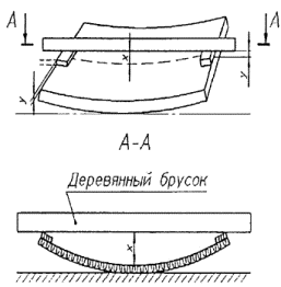 Рисунок Б.2 — Измерение отклонения от прямоугольности по толщине плиты Измеряют расстояние а между кромкой угольника и ребром плиты, образуемым короткой боковой и лицевой гранями, в том месте, где оно максимально. Б.6.3 Повторяют измерение для трех остальных углов плиты. Б.6.4 Выраженный в миллиметрах результат каждого измерения округляют до ближайшего целого числа. Вычисляют среднее арифметическое значение округленных результатов четырех измерений. Б.6.5 В протоколе испытаний указывают выраженное в миллиметрах среднее арифметическое значение результатов четырех измерений отклонения от прямоугольности по толщине плит. Б.7 Измерение отклонения от плоскостности плит Б.7.1 Сущность метода заключается в измерении локального отклонения от плоскостности плиты при помощи деревянной поверочной линейки. Б.7.2 Плиту кладут на плоскую горизонтальную твердую поверхность выпуклой стороной вниз. На плите устанавливают два деревянных бруска, толщина которых известна и равна у, на бруски вдоль плиты кладут деревянную поверочную линейку (рисунок Б.3).