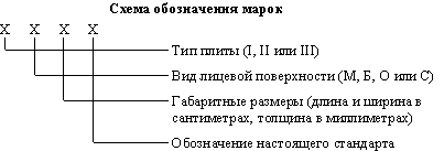 Примечания: 1. Размеры плит по длине и ширине должны быть кратными 50 мм. 2. Размеры и форма плит должны быть согласованы заказчиком с предприятием-изготовителем при заключении договора на поставку. 3. Плиты другой формы в плане допускается изготавливать по индивидуальному заказу. 4. Допускается производство брекчиевидных формованных плит толщиной до 60 мм, если в качестве кусков природного камня используют отходы от производства плит или архитектурно-строительных изделий толщиной до 40 мм. (Измененная редакция, Изм. № 1). 1.5. Плиты обозначают марками в соответствии с нижеприведенной схемой.